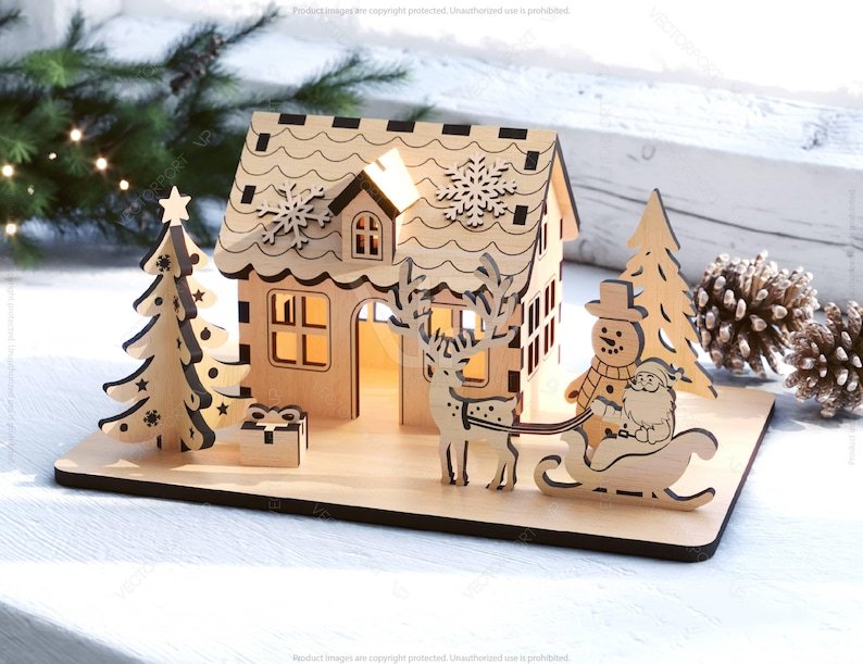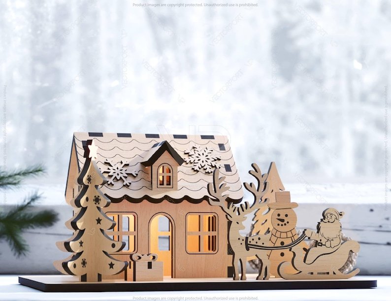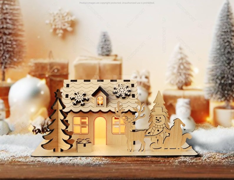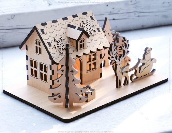 Tamamı lazer kesim ahşaptan üretilmiş olan bu mini ev; yılbaşı süslemeleri, vitrin dekorasyonu, masaüstü aksesuarı veya hediye olarak ideal bir seçenektir.