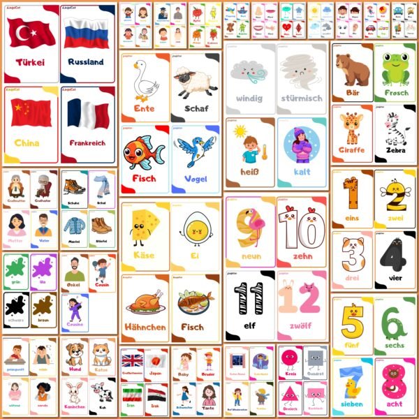Çocukların Almanca kelimeleri görerek, eşleştirerek ve tekrar ederek öğrenmesini destekleyen sade ve anlaşılır bir kart setidir. Okul öncesi ve ilkokul düzeyine uygundur.