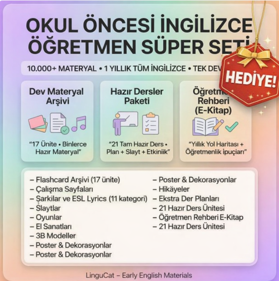 Bu set, okul öncesi İngilizce derslerinde öğretmenin sınıf içinde doğrudan kullanabileceği temel materyalleri tek pakette sunmak için hazırlanmıştır.