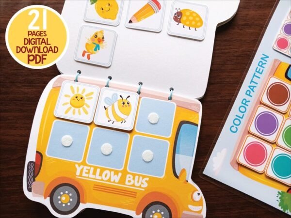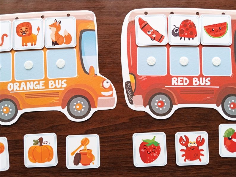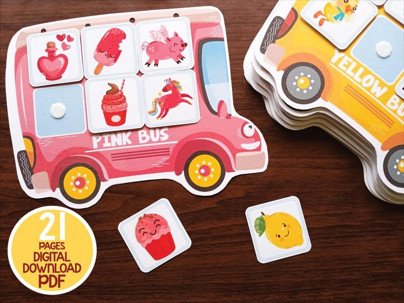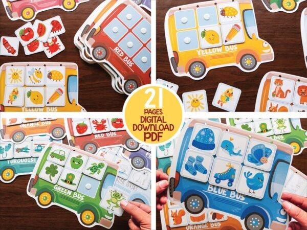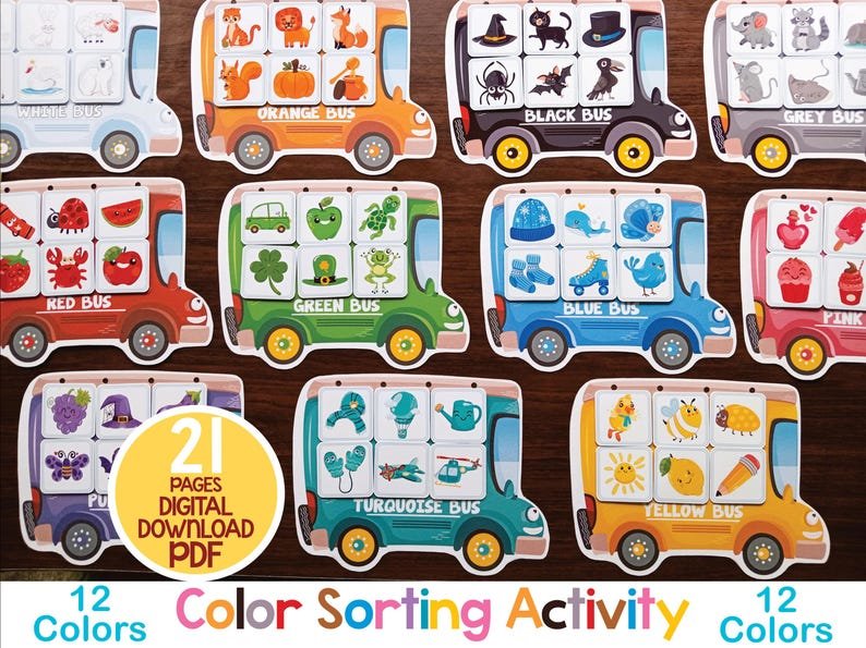 Otobüs temalı bu renk eşleştirme ve sınıflandırma etkinliği, 2–6 yaş arası çocukların renkleri tanımasını ve ayırt etmesini desteklemek için hazırlanmıştır.